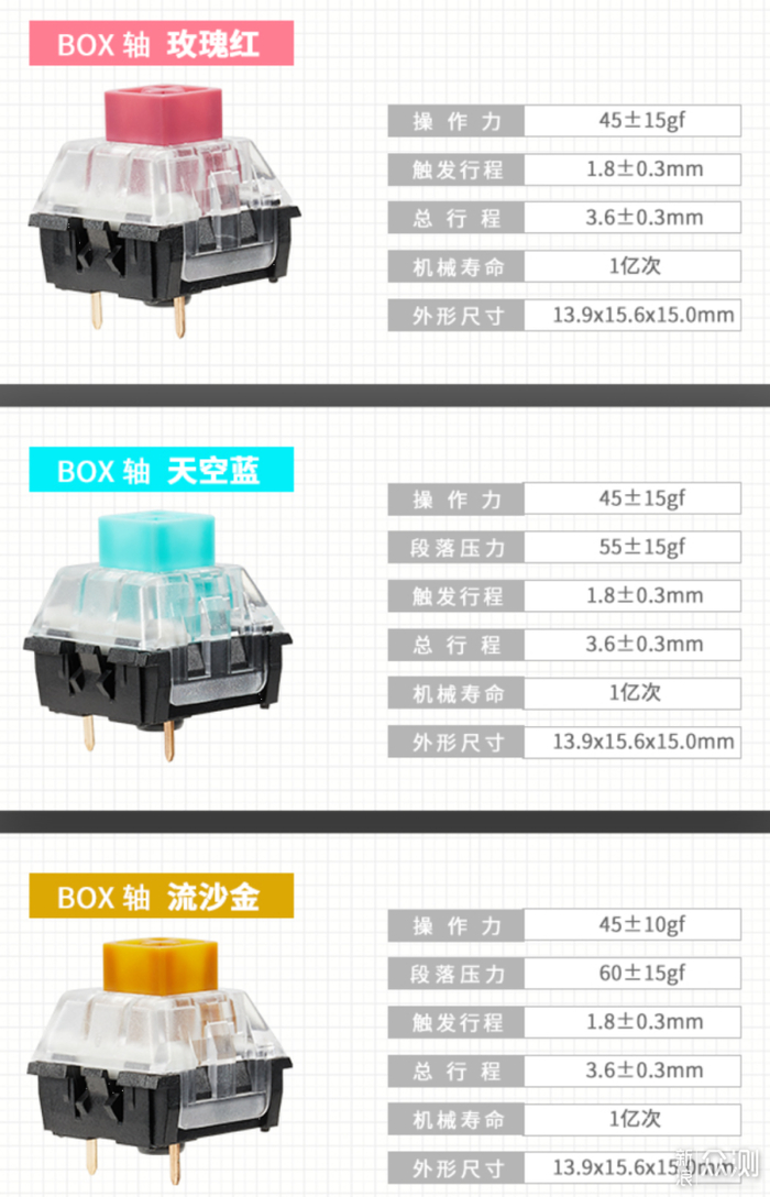 ▼X PRO 系列的轴体为 Kailh 升级 BOX 轴,BOX 轴最大的特点就是轴座、防尘盖和活动推杆三者形成的密封机构,不仅防尘防水对于寿命也有加成,新款轴体在原有 BOX 轴的基础上更是直接升级到 1亿次使用寿命,这个寿命上和光学轴体的寿命平起平坐了。此外升级版 BOX 轴采用了新的配色方案以及新的名称,分别为玫瑰红 / 天空蓝 / 流沙金,具体参数如下