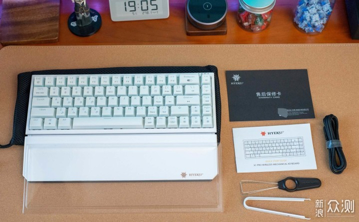 ▼配件方面包括键盘×1、防尘罩×1、手托×1、Type-C充电线×1、拔键器×1、拔轴器×1、说明书×1、售后保修卡×1、2.4G 接收器 ×1。X1 Pro 有点特别,还有个专门的收纳袋,可以将键盘防尘罩手托全部装进去,带着着出门还蛮方便的