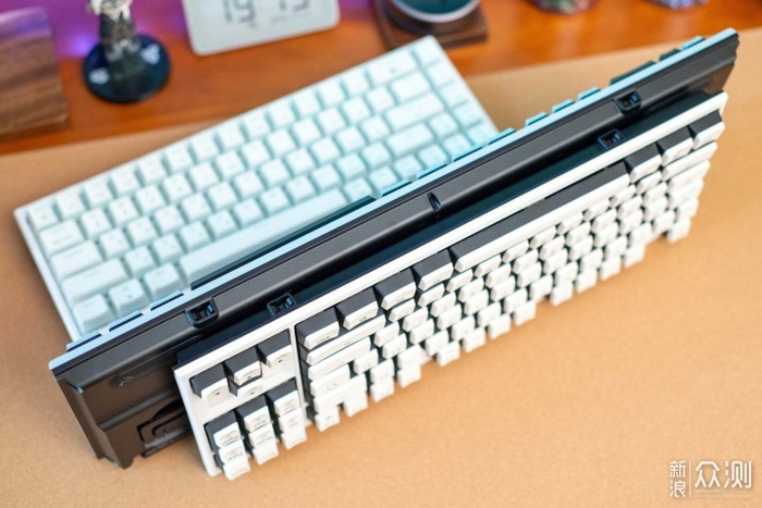 ▼键盘外壳采用了黑白撞色的设计方案,上下盖有明显的的色彩分层,大量线条和 直角元素的加入使得键盘看起来很有立体感。