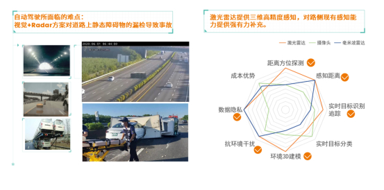 据陈娜博士介绍,目前,自动驾驶所面临的难点是视觉+Radar方案对道路上静态障碍物的漏检导致的事故。而激光雷达作为一种高精度、高灵敏度、短延时的感知传感器,已成为重要的路侧传感器之一,可以精确识别复杂路口路端的交通信息,提供多种交通参与者的高精度轨迹,支持智慧交通数据采集、车路协同感知和自动驾驶测试验证等。