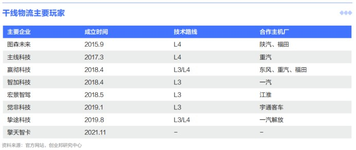 国内干线物流的玩家包括图森未来、嬴彻科技、智加科技、主线科技、挚途科技、宏景智驾、觉非科技和擎天智卡等主攻干线物流场景的创新公司,其中图森未来、主线科技主攻L4路线,通过自动驾驶测试收集数据优化算法;嬴彻科技、智加科技等则主攻L3路线,通过产品前装落地通过数据-算法飞轮升级至L4。另外Robotaxi领域企业小马智行在2021年推出了重卡独立品牌小马智卡,截止2021年11月底,小马智卡实现了超过5万公里的商业运营里程,累计运送了1.64万吨货物。
