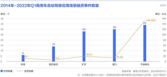 2014年至2022年第一季度干线物流、矿区和港口三大场景热度最高,投资事件分别为34起、28起和30起,投资金额分别为149.83亿元、19.51亿元和13.32亿元。