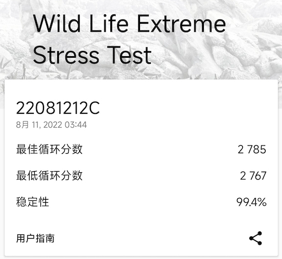 在20分钟3DMark 高负载Wild Life Extreme 20分钟循环压力测试中,稳定性高达99.4%,最佳循环分数为2785分,最差循环分数为2767分。