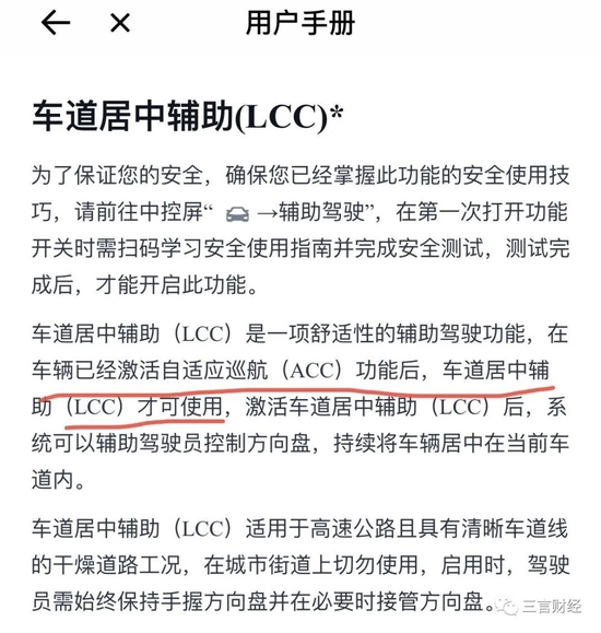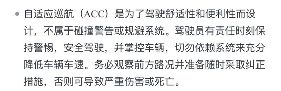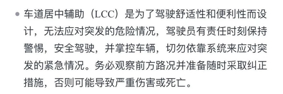 无论是ACC还是LCC功能,用户手册中都有类似的描述:ACC/LCC是为了驾驶舒适性和便利性而设计,不属于碰撞警告或规避系统/无法应对突发的危险情况,驾驶员有责任时刻保持警惕、安全驾驶,并掌控车辆。切勿依赖系统来充分降低速度/应对突发的紧急状况。务必观察前方路况并准备随时采取纠正措施,否则可导致严重伤害或死亡。