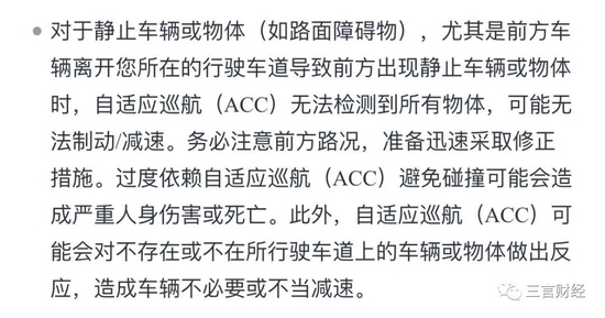 原文是这样的:对于静止车辆或物体(如路面障碍物),尤其是前方车辆离开您所在的行驶车道导致前方出现静止车辆或物体时,自适应巡航(ACC)无法检测到所有物体,可能无法制动/减速。