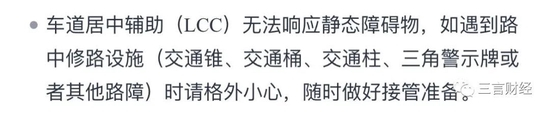 用户手册中提到LCC无法响应静态障碍物,如遇到路中修路设施(交通锥、交通桶或其他路障)时请格外小心,随时做好接管准备。