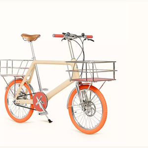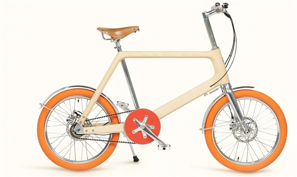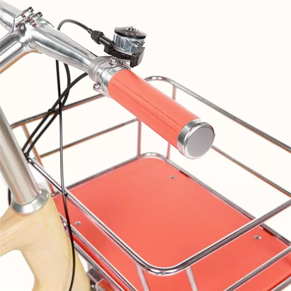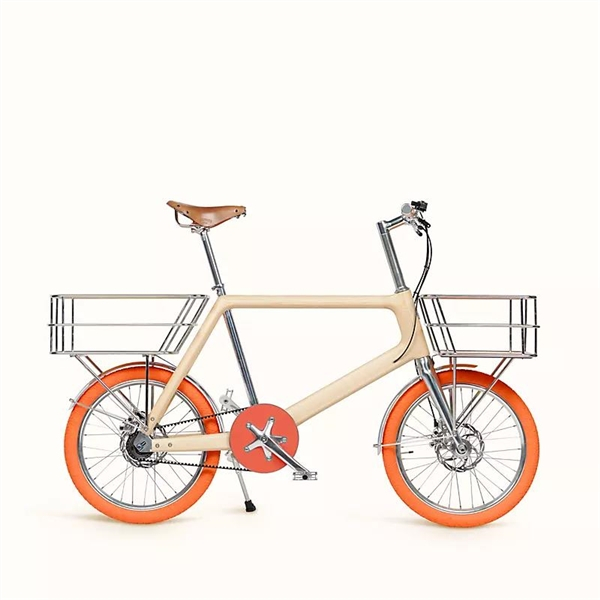 采用白蜡木、铝和Spad皮革打造, 把手及坐垫支架处配有车灯,前侧饰有系列标识上釉徽章,坐垫处饰有“Hermes Paris”烫印字样,同时配有前后车篮子,支持4挡速度调节。