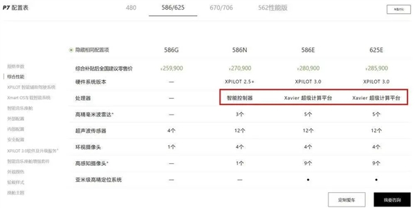 比如小鹏P7目前有三种智能驾驶系统的硬件配置,分别对应着三个级别的功能:丐版车型仅拥有定速巡航功能,而XPILOT 3.0则拥有高速NGP智能导航辅助驾驶,而2.5版本,则只有基础的LCC车道居中辅助和ACC自适应巡航功能。三个版本,相差了三个时代。
