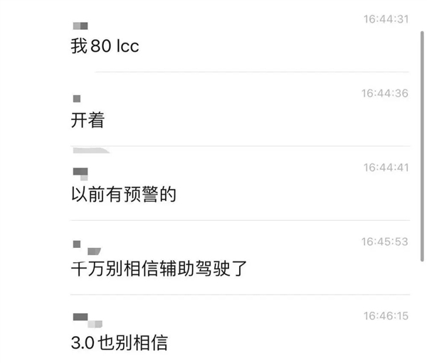 从疑似涉事车主的微信聊天记录来看,发生事故时车辆时速在80km/h左右,并开启了LCC车道居中辅助功能,直到追尾了停靠在最左侧车道的人员和车辆。