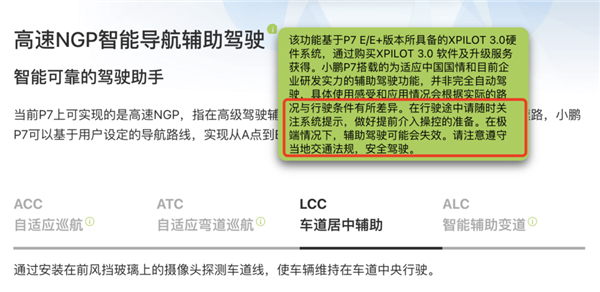 但在几乎所有功能描述的旁边,小鹏汽车都注释了警示告知,如“请随时关注系统提示,做好提前接入操控的准备”、“请注意遵守当地交通法规,注意安全驾驶”等。