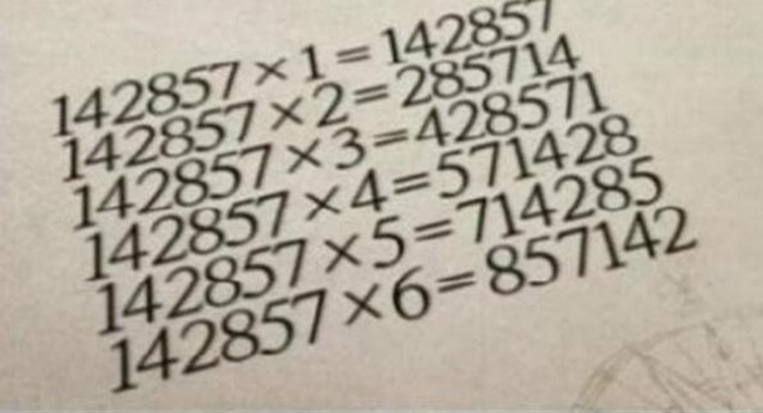 另外一个有趣的数,在古埃及金字塔里面的墙上,它便是142857。中国人把它叫做走马灯数。将142857这个数乘以1至6之间的任何一个自然数,得到的数字都是“142857”,只不过这些数字的顺序被打乱了。