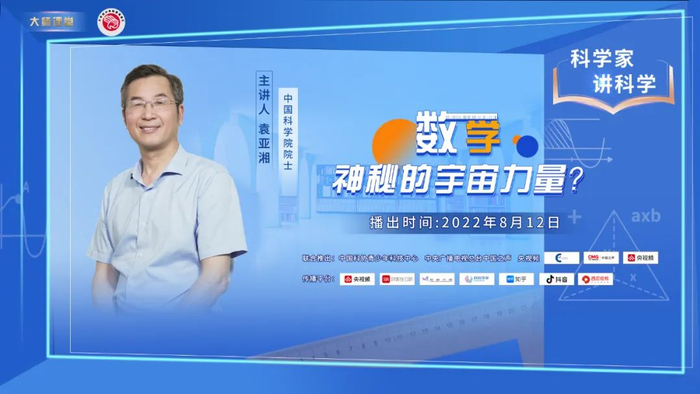 中国之声、央视频携手中国科协青少年科技中心,推出全媒体系列科普栏目——大师课堂《科学家讲科学》。20位院士名家畅谈热点事件,为公众科普答疑。本期有请中国科学院院士袁亚湘和科普创作人周哲,一起畅谈你所不知道的数学之美。