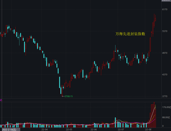 由于是非常新的炒作概念,各大股票软件中包含的成份股并不相同。通达信Chiplet板块有21只个股,同花顺有22只个股。东财与大智慧都只有11只,其中7只相同4只不同。而万得没有Chiplet板块,只有先进封装板块,而且板块中缺少最正宗的芯原股份,下图即是万得先进封装指数走势图。
