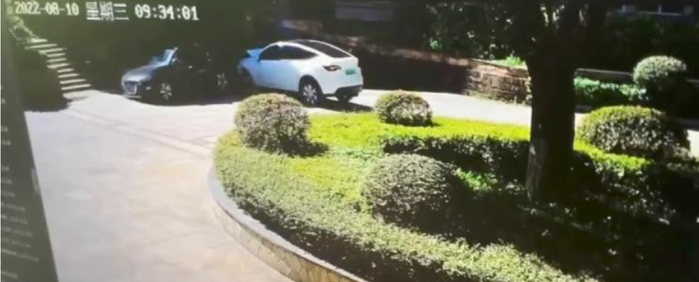 另一段监控视频显示,这辆Model Y冲进小区后直接怼到小区墙体后停了下来,期间还撞上了小区内的另外一台黑色轿车。