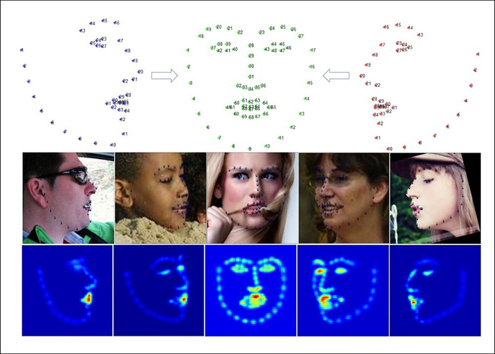我们以论文《Joint Multi-view Face Alignment in the Wild》来说,其展示了多视点人脸对齐,正面对齐包含 68 个特征点,而侧脸对齐只有 39 个。典型的 2D 人脸对齐算法使侧轮廓视图隐藏了 50% 的特征点,这会妨碍模型的识别、训练以及后续人脸合成。