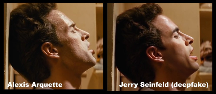 意识到这个缺陷后,许多病毒式 Deepfake 都会有针对性地进行规避。一些人做出了一些努力,比如 YouTube 上就有人做过实验,他们通过大量的后期处理,将 Jerry Seinfeld 的脸替换到《低俗小说》 (1994) 中的紧张场景中,获得了很棒的侧视图。