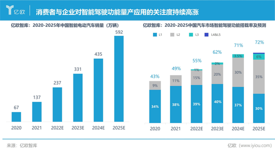 不仅如此,中国汽车智能驾驶功能渗透率也在不断提升,亿欧智库预测2025年中国汽车智能驾驶功能渗透率将达到72%。