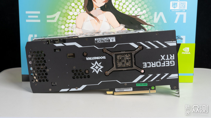 显卡采用大面积黑色覆盖以及线条、LOGO刻画的金属背板,尾端部分是镂空的散热孔,有利于显卡通风散热,对于星曜系列显卡,RTX 30系这一代除了RTX 3090 Ti,背板都是黑色的,期望下一代显卡能采用全白色吧。