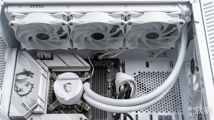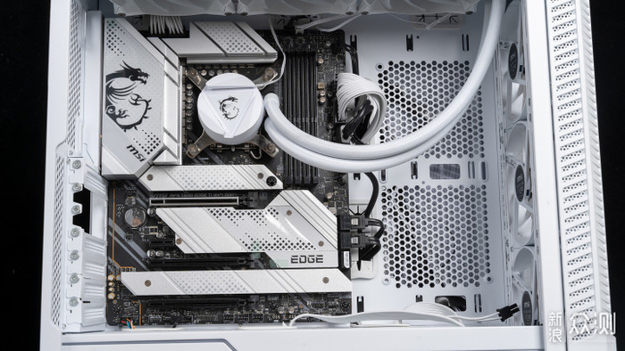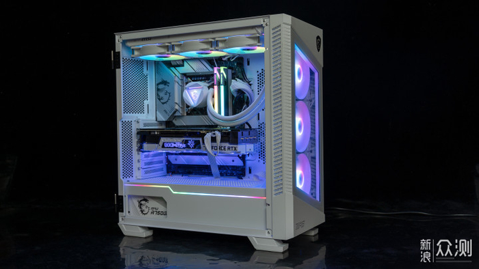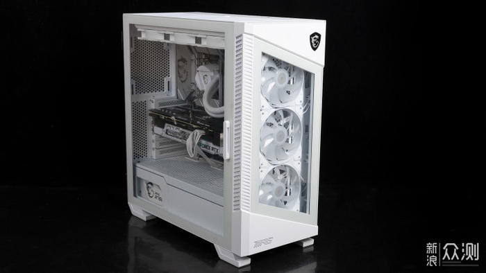 机箱是微星MPG VELOX 刀锋100R WHITE,外观属于典型的侧透机箱设计,前部预装三枚120mm ARGB风扇,拥有六路ARGB控制器,支持显卡竖置展示模式,前置I/O支持LED灯效切换、USB 3.2 Gen 2 Type-C等特色,功能和设计是满分的。