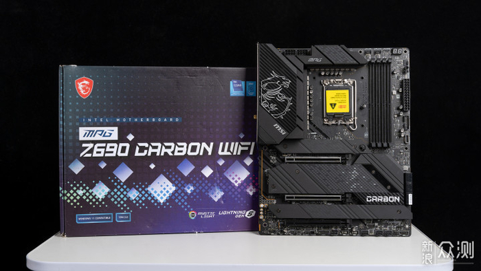 DDR5平台的主板采用微星MPG Z690 CARBON WIFI DDR5 暗黑,外观采用全覆盖装甲+电竞为主调的风格,拥有18相一体化DR.MOS直连CPU核心供电,内存最高支持超频至DDR5-6666Mhz,第一根显卡插槽支持PCIe5.0 X16,M.2固态硬盘扩展槽多达五组,其中四组均支持PCIe 4.0 X4,插满存储空间无压力,是一款全能向发展的高端Z690主板。