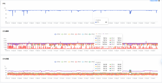 在室温27℃的环境下,我们使用小米平板5 Pro 12.4运行了30分钟原神。从帧率和CPU频率图来看整体的表现倒也符合预期,除了偶尔的波动外帧率还是比较稳定的。