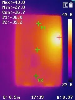 使用温度枪测量平板表面温度,主要热源集中在SoC附近,最高为43.8℃,其余部分普遍在36℃左右,手持的话是完全OK的。