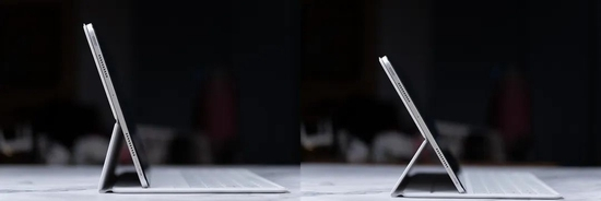 不过我还是更推荐使用这次新推出的双档位键盘式双面保护壳,手上的这款白色版采用的有机硅皮革材质耐脏抗老化、只需轻擦就能去除表面污渍不说,还带有110°观影模式和120°工作模式两种不同档位。