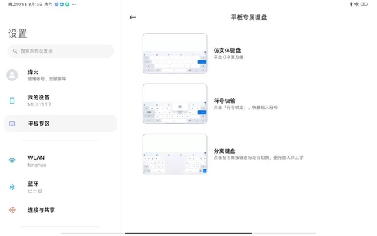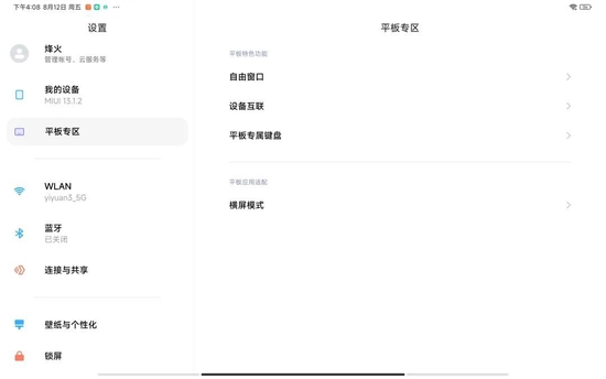 在新增的“平板专区”中,MIUI Pad集成了平行窗口、设备互联、平板专属键盘的设置入口,也可以设置APP是否需要在横屏下进入横屏模式显示。