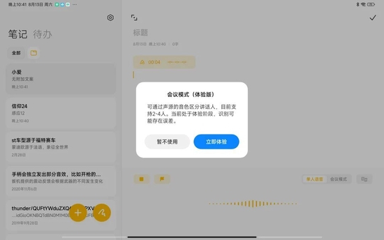 在小米笔记的“会议模式”下,小米平板5 Pro 12.4可以通过声源音色快速区分讲话人并实时转换为文字,支持最多4人讲话。