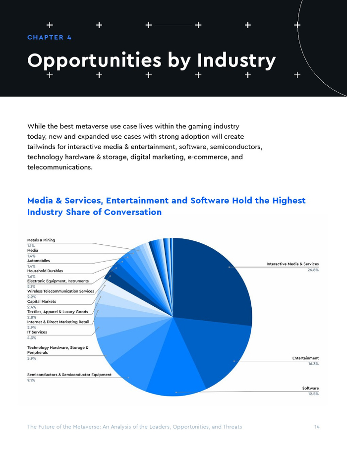 虽然当今游戏行业中存在着最好的元宇宙用例,但新的和扩展的用例被广泛采用,将为交互式媒体和娱乐、软件、半导体、技术硬件和存储、数字营销、电子商务和电信创造顺风。