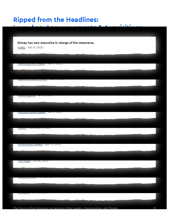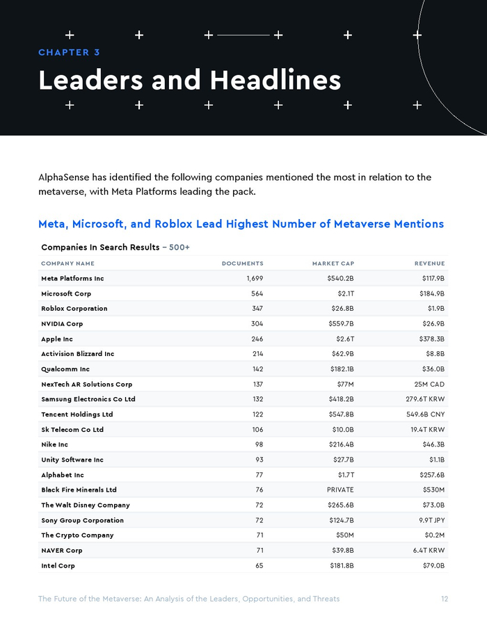 AlphaSense在报告中确定了与元宇宙相关的被提及最多的公司,其中Meta Platforms处于领先地位。