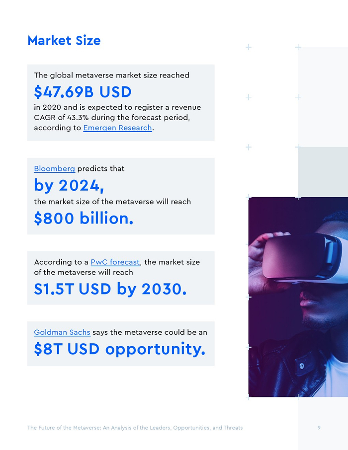 2020年元宇宙市场规模为476.9亿美元,预计将有8000亿至8万亿美元的机会。