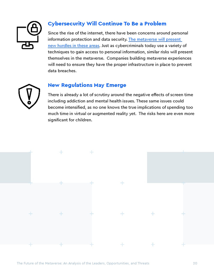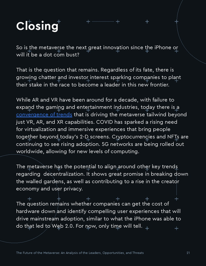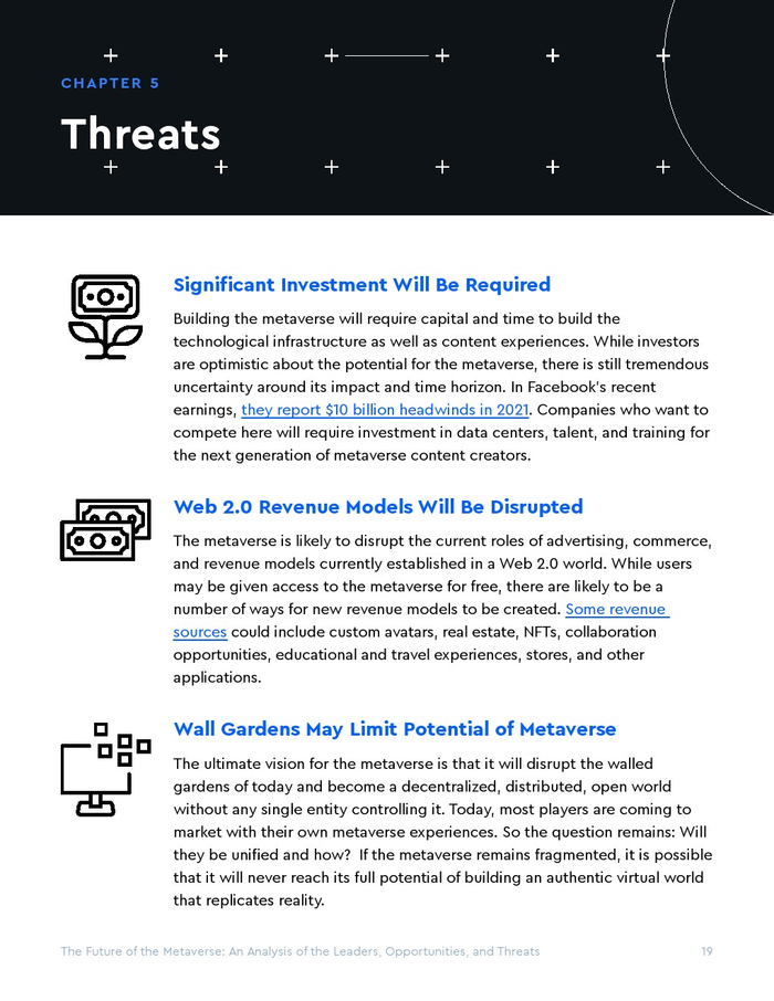 元宇宙需要资金和时间来构建技术基础设施和内容体验。尽管投资者对元宇宙的潜力持乐观态度,但其影响和时间范围仍存在巨大的不确定性。在Meta最近的财报中, 2021年将面临100亿美元的逆风。想要在这里竞争的公司将需要对数据中心、人才和培训下一代虚拟世界内容创作者进行投资。