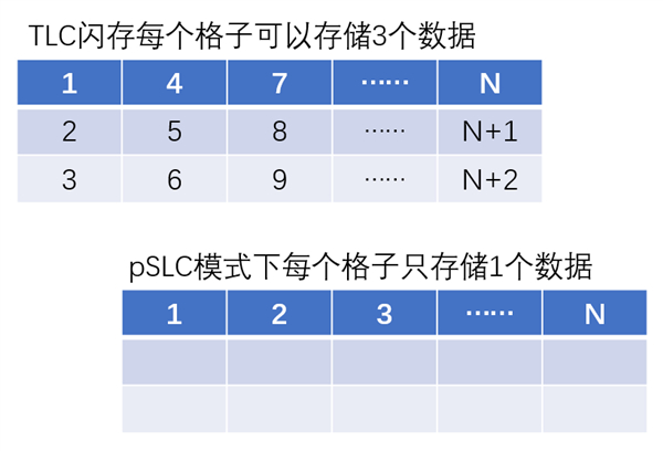 为了解决这个问题,一些存储卡厂商使用了名为“全盘pSLC”的工作模式(p=pseudo,有伪/假的意思,也翻译成“模拟SLC”),直白来说就是把当前主流的TLC闪存颗粒当作SLC颗粒使用。这确实能让写入速度成倍提高,而且几乎不存在“掉速”问题,但代价就是可用容量只有原本的1/3。