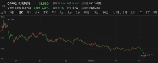面对经营层面的诸多疑问,投资者普遍“用脚投票”。盘面数据显示,自发布盈警公告以来,泡泡玛特股价自7月以来已经跌超40%,距离曾经107.24港元/股的高点跌幅高达8成以上。