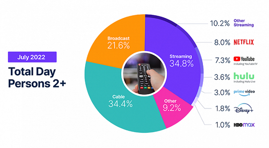 8月19日消息,根据尼尔森发布的月度数据显示,7月美国流媒体视频服务使用量占收视率的34.8%,高于有线电视的34.4%和无线广播电视的21.6%,首次占据最大电视收视份额。