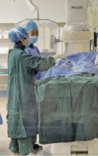 几天后,“拆弹专家们”全部就位,在介入科、麻醉科的全力配合下,梁传声教授按照既定的手术方案,先为患者实施全脑血管造影术,然后将微导管置入动脉瘤腔内,使用弹簧圈和支架将动脉瘤完全栓塞。术后全脑造影见整个脑血管造影剂充盈良好,无充盈缺损,循环时间正常,手术取得圆满成功。麻醉苏醒后,郭阿姨状态良好,神志清楚,言语及肢体活动正常。返回病房后,神经外科护理人员在张擎护士长的带领下对郭阿姨采用心电、血压、血氧饱和度监测等全程监护,保证术后安全。次日,穿刺点压迫器被取下,穿刺点恢复较好。术后第三日,复查郭阿姨头部CT动脉瘤栓塞完好,患者自行下床活动,恢复日常生活。此次手术的顺利完成,开创了医院动脉瘤介入治疗的先河,标志着医院神经外科的发展再次迈上新的台阶。