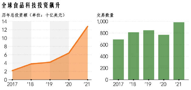 投资者也正在权衡,并采取了相应行动。根据Crunchbase的数据,从实验室培植肉到室内城市农场等多个面向,食品科技领域去年共获得了创纪录的128亿美元风险投资,是前年的两倍。其中,近一半的资金流向了生产传统肉类/海鲜/乳制品替代品的公司。