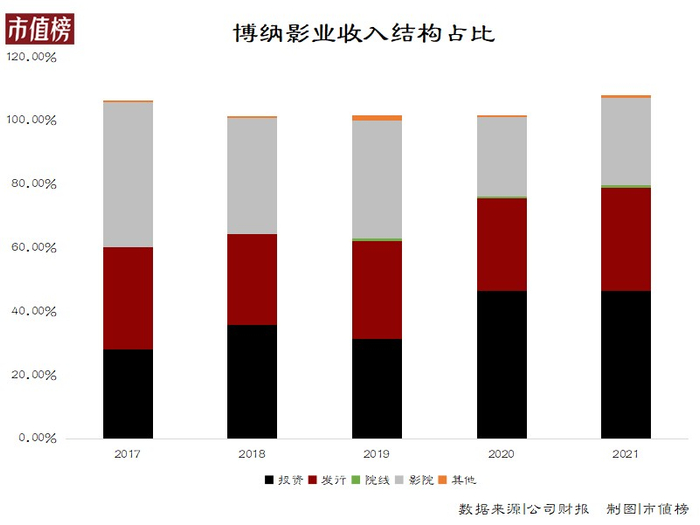 2021年,博纳实现收入31.24亿元,同增94%,从营收规模上已经摆脱2020的颓势,与2019年基本持平。当年票房最高的《长津湖》,贡献了其中的1/3。