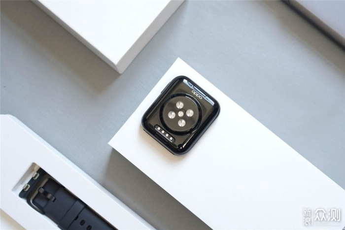 背面采用的LNP特种玻璃纤维增加PC,从上往下,分别是表带快拆按钮、光学健康感应区域、充电口及快拆按钮。