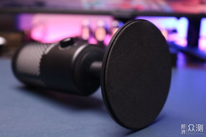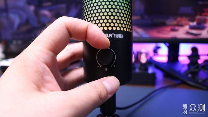 得胜的这款麦克风logo下方有一个旋转按钮,是用于麦克风音量大小的调节,标记+-,我们可以通过耳机监听模式来确定麦克风的音量,在实际体验当中,音量调大之后可以听到周围细小的声音,这样也能方便我们对于收音环境有所了解。