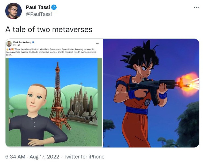 还有人拿 Horizon Worlds 和《堡垒之夜》比较。在《堡垒之夜》和《龙珠 Z》的联动里,孙悟空可以在游戏里端起霰弹枪,精细的画面和放飞的想象力,似乎更贴近所谓的元宇宙。