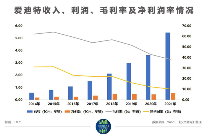 爱迪特成立于2007年,长期以来,主要从事以氧化锆瓷块为代表的口腔修复材料的生产销售及其配套设备的销售。2017年3月,爱迪特就已顺利在新三板挂牌交易。据公司披露,虽然到2021年,爱迪特的收入规模还仅有5.45亿元,但自有公告的2014年起,其收入就呈现稳定的增长趋势,不过在此期间毛利率与净利润率却出现了下滑。