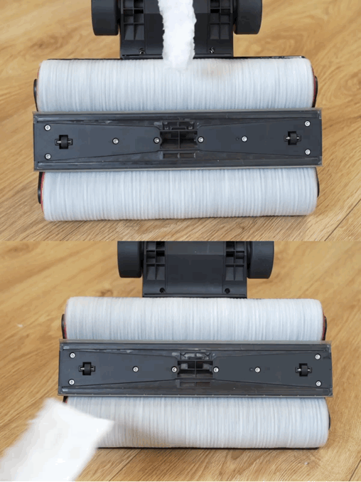 ▼先来看看追觅M13都有哪些创新的改变,首先就是这个双滚刷的刷头,洗地机工作时两个滚刷会同时向内旋转,双倍的摩擦力,每一次推拉,都会让清洁区域被清洁上两遍,理论上来说相较于单滚刷的洗地机,双滚刷应该具备跟高的清洁效率以及更大的清扫覆盖面积。