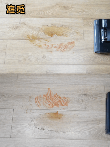 ▼我个人认为双滚刷真正的优势还是在清洁顽固污渍,我用追觅M13和一台单滚刷洗地机分别去清理已经放置一晚完全干掉的番茄酱,咖啡液以及酱油,实际测试发现单滚刷的洗地机来回拖动了13次才将污渍完全清除,而追觅M13只用了4次,清洁时间缩短了60%以上。