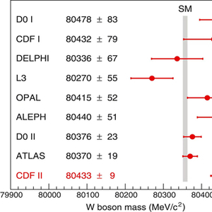 最近,在经历长达十年的分析后,美国费米实验室CDF-II合作组在Science杂志上公布了W玻色子质量的最新实验结果:80.4335±0.0094 GeV,其测量精度达到了万分之一,也是迄今为止世界上最为精确的测量结果。目前所有测量W玻色子质量的实验结果见图1。众所周知,W玻色子及其中性伴子Z玻色子是自然界中传递弱相互作用的媒介粒子,是理解电弱对称性破缺机制和基本粒子质量起源的重要一环。而此次CDF-II合作组测量到的W玻色子质量与标准模型理论预言值存在7个标准偏差,这很可能暗示着超出标准之外新物理的存在,得到了全球物理学家的广泛关注。