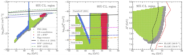 图2:左为同时满足银心GeV伽马射线超出和反质子超出的暗物质质量区间(红色区域);中为类标准模型希格斯粒子(SM-like Higgs)共振湮灭过程在暗物质直接探测上的观测前景(蓝色区域);右为暗物质粒子与次轻中性希格斯粒子(A)共同湮灭过程在高亮度强子对撞机上的可观测预期(绿色区域)。