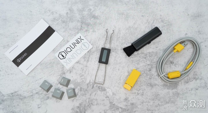 配件具体包括说明书、贴纸、拔键/拔轴器、清洁刷、2.4G接收器,USB TYPE-C数据线、MAC替换键帽。
