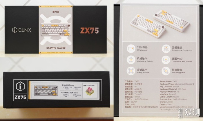 依旧是铝厂(IQUNIX)很有标志性的包装风格,有腰封并附上详细的产品信息,如产品外观,尺寸大小,75%布局,81键,热插拔轴,ABS外壳材质,PBT键帽材质等。