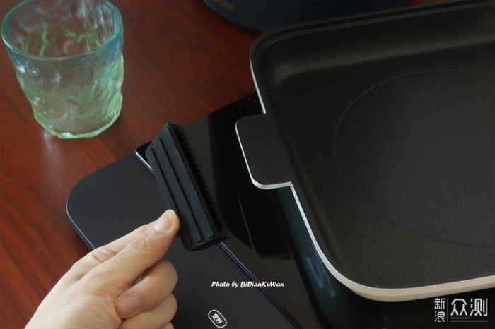 3,由于加热盘中央有凸起的温感触点,可以做到“抬锅停火”,实测非常灵敏(锅体脱离加热盘时,“滴”提示音响起的同时,旋钮LED屏也会显示“无锅具”)。